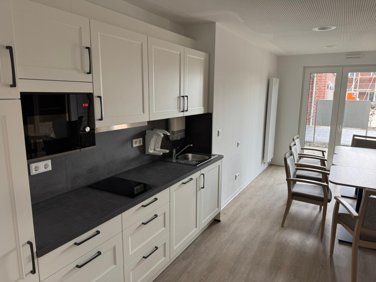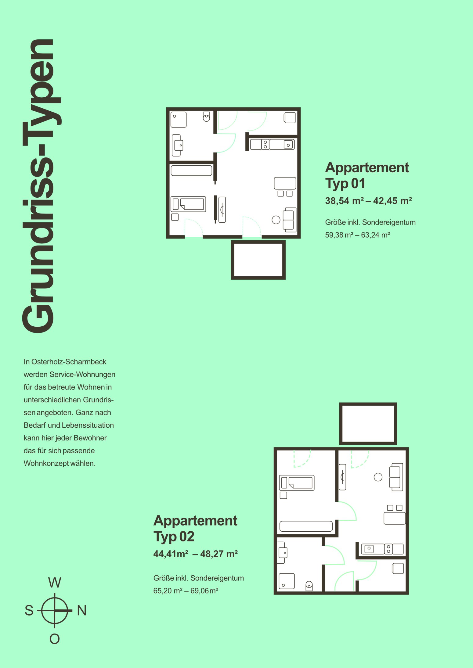 Das moderne Wohnkonzept bietet für Alleinstehende und Paare mit Service-Charakter genau das Richtige: Die 28 barrierefreien Wohnungen sind individuell gestaltet und bieten Größen zwischen 38 und 70 Quadratmetern. Der offene Wohn-, Koch- und Essbereich bildet das Herzstück und geht harmonisch in den Balkon oder die (Dach-)Terrasse über. Die Küchenzeile mit ergonomischer Arbeitsfläche lädt zum Kochen ein, während der Wohnraum mit integriertem Essbereich zur Entspannung einlädt. Das barrierefreie Bad mit bodengleicher Dusche und Haltegriffen sorgt für Sicherheit im Alltag. Zusätzlich gibt es in jeder Wohnung einen Abstellraum.