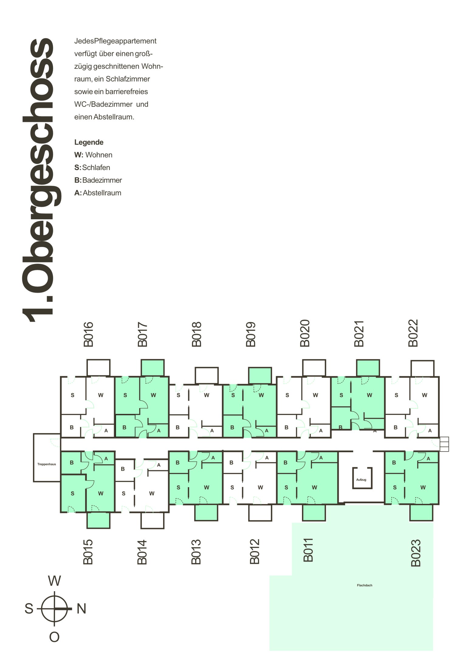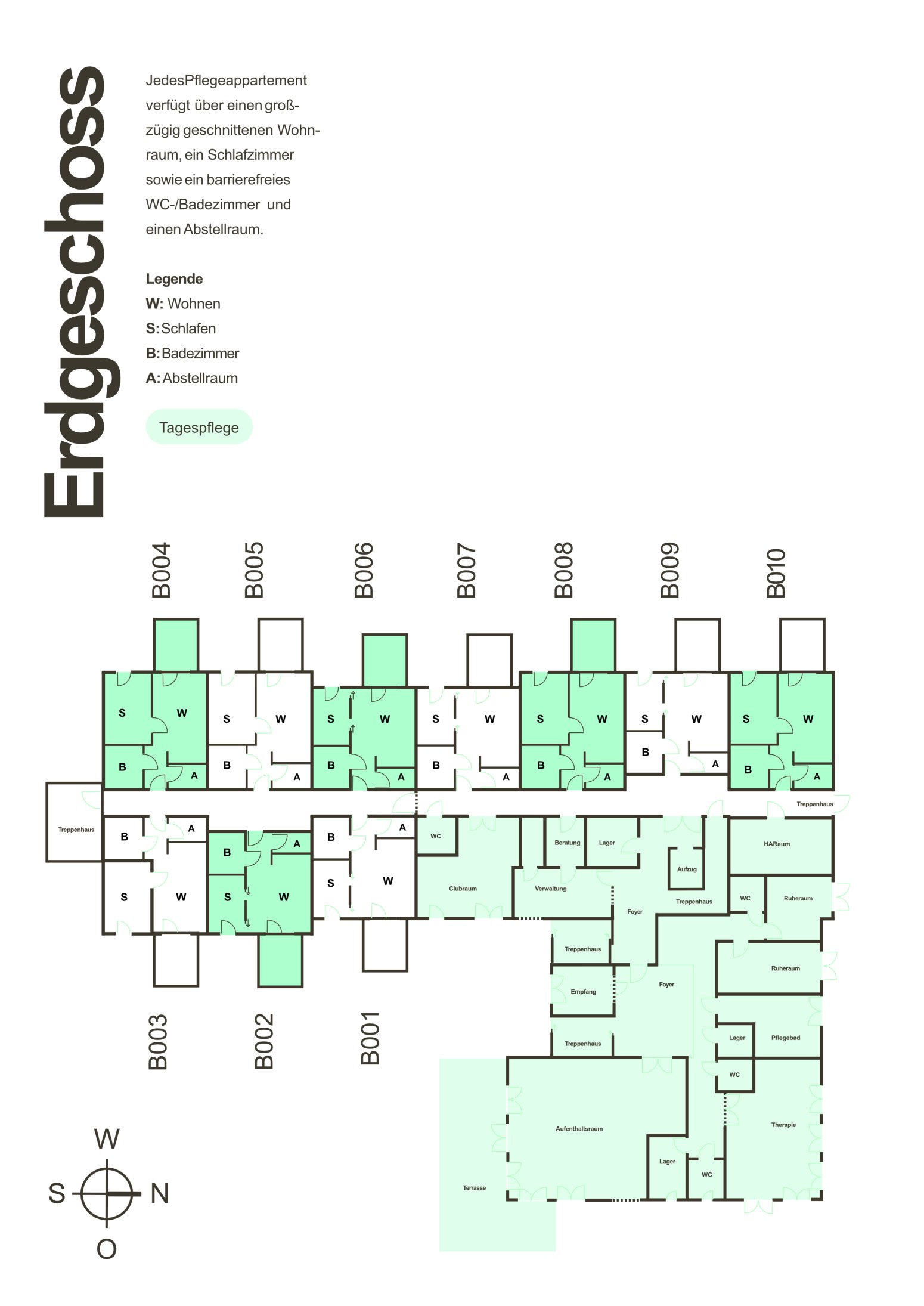 Südlich des Residenzgebäudes wird ein Neubau für betreutes Wohnen mit Service errichtet. Dort wird im Erdgeschoss eine Tagespflege für Menschen mit physischen Einschränkungen und Demenz eingerichtet. Die 28 Einheiten in den beiden oberen Geschossen sind barrierefrei und teilweise rollstuhlgerecht ausgebaut. Jede Wohnung verfügt über Balkon oder Terrasse, eine Wohnküche mit Einbauküche, ein Schlafzimmer, ein bodengleiches Duschbad und einen Flur mit Abstellmöglichkeiten. Der Clubraum dient als Treffpunkt für den nachbarschaftlichen Austausch.